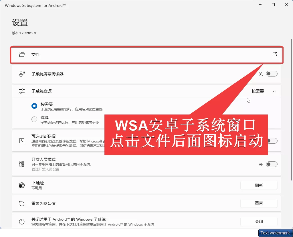 Win11设置选择WSA安卓子系统应用,WSA窗口中,点击文件后面图标启动安卓子系统;