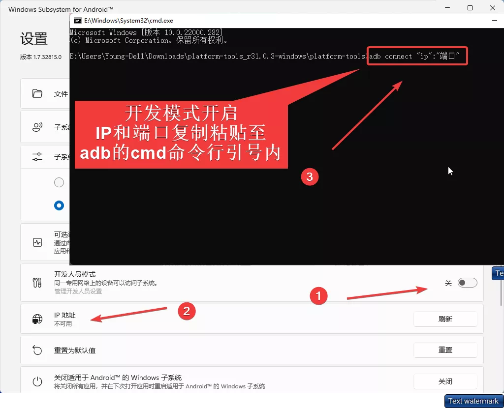 1. 首先,安卓子系统的WSA窗口,打开开发人员模式;(记下IP和端口)