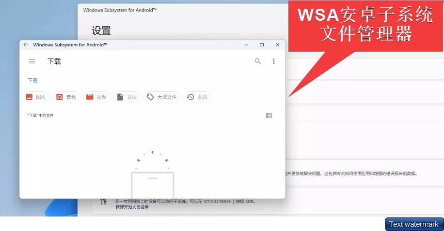 等待完成请求更改后,重启电脑后,WSA窗口中,再点击文件,就会进入到安卓文件管理器了;