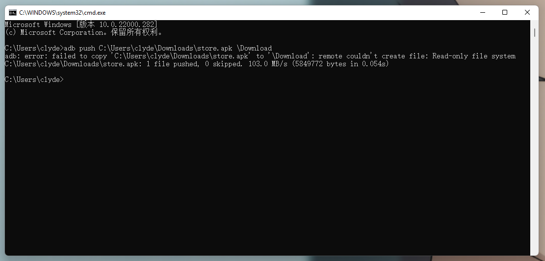 针对 apk 文件,我们使用 adb install 指令一般就能进行安装。假设你下载好的安装包路径为 C:\clyde\store.apk,则进行安装完整指令为 adb install C:\clyde\store.apk。