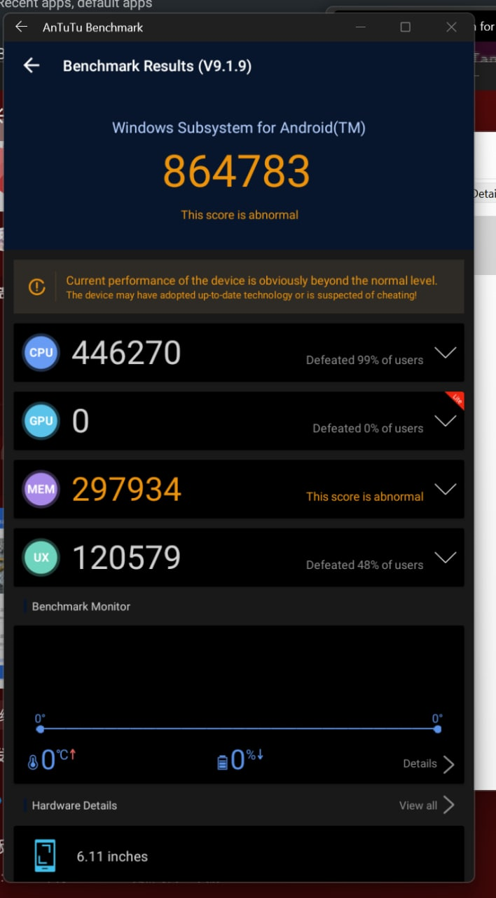 这个预装载界面都能感觉到时不时会掉帧一下原神作为新晋性能测试软件,我们自然也试着安装了下,结论是可以安装,在 5950X 上中高画质还算的上流畅,只不过经常性的出现掉帧很难受,这里我很怀疑和 GPU 有关(可以看到安兔兔的 GPU 跑分为 0 分)。此外游戏体验也不算好,除了适配了 WSAD 方向键,其他均没有适配,如果打算在 Windows Windows Subsystem for Android™ 上游玩原神可能要失望了;微软官方也表示,键盘和鼠标右键的需要进行额外适配。