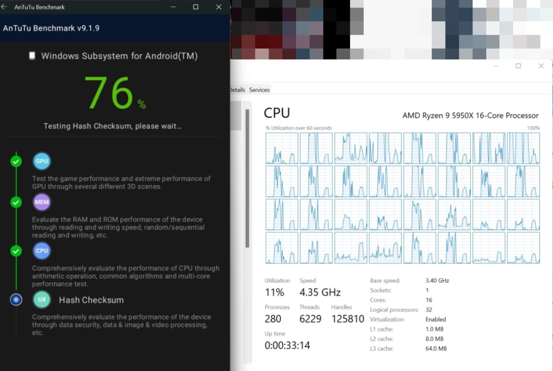 另外跑分时我还注意到了 5950X 其实并没有完全跑满,有不少核心的负载很低,我一开始怀疑是 Windows Windows Subsystem for Android™ 只跑在一部分的核心上,后续使用 adb shell&cat /proc/cpuinfo 命令检查 CPU 的时候才发现其实所有的核心都已经传递进去了,只是安兔兔跑分确实压榨不出所有的性能而已。