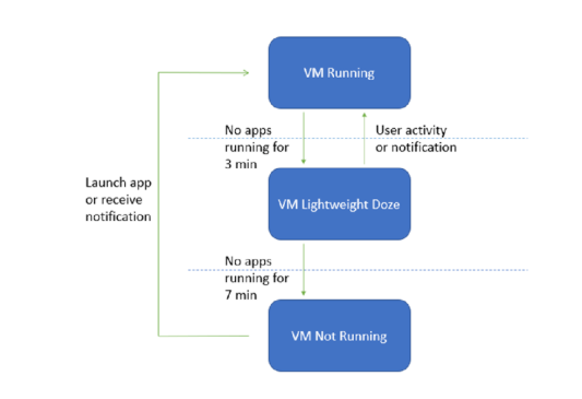 如果没有任何 Android App 运行,系统将由运行状态变为轻量低电耗模式状态,在收到用户活动或者通知时会重新回到运行状态。否则 7 分钟后,继续没有 Android App 运行的情况下系统会变为不再运行的状态;直到用户重新启动 App 或是收到了新的通知,这时系统会再回到运行状态。这样理论上能很好的节约笔记本上的各项资源,不止运行得更多还能和以前一样流畅。