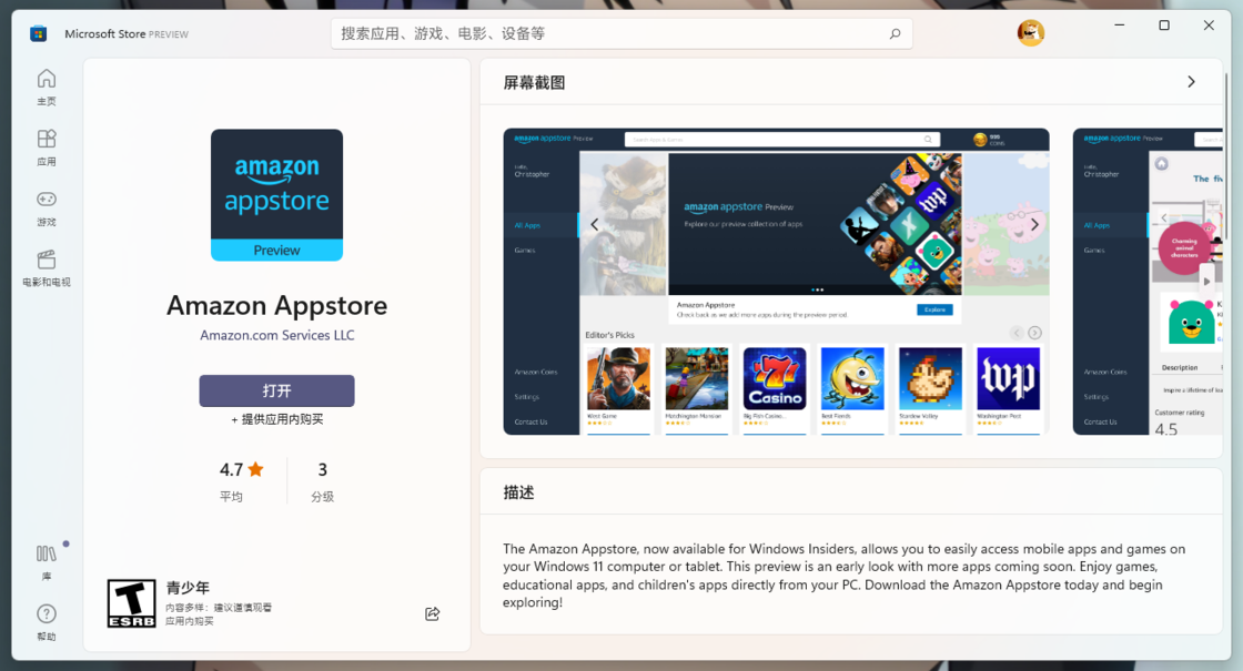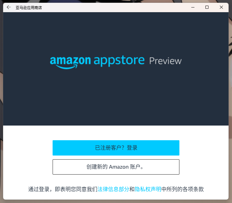 最后点击 这个链接 跳转到 Amazon Appstore 的商店界面,点击打开,就能跳转到 Amazon Appstore 进行登录并下载、安装 Android 应用了(需要美区 Amazon 账号)。