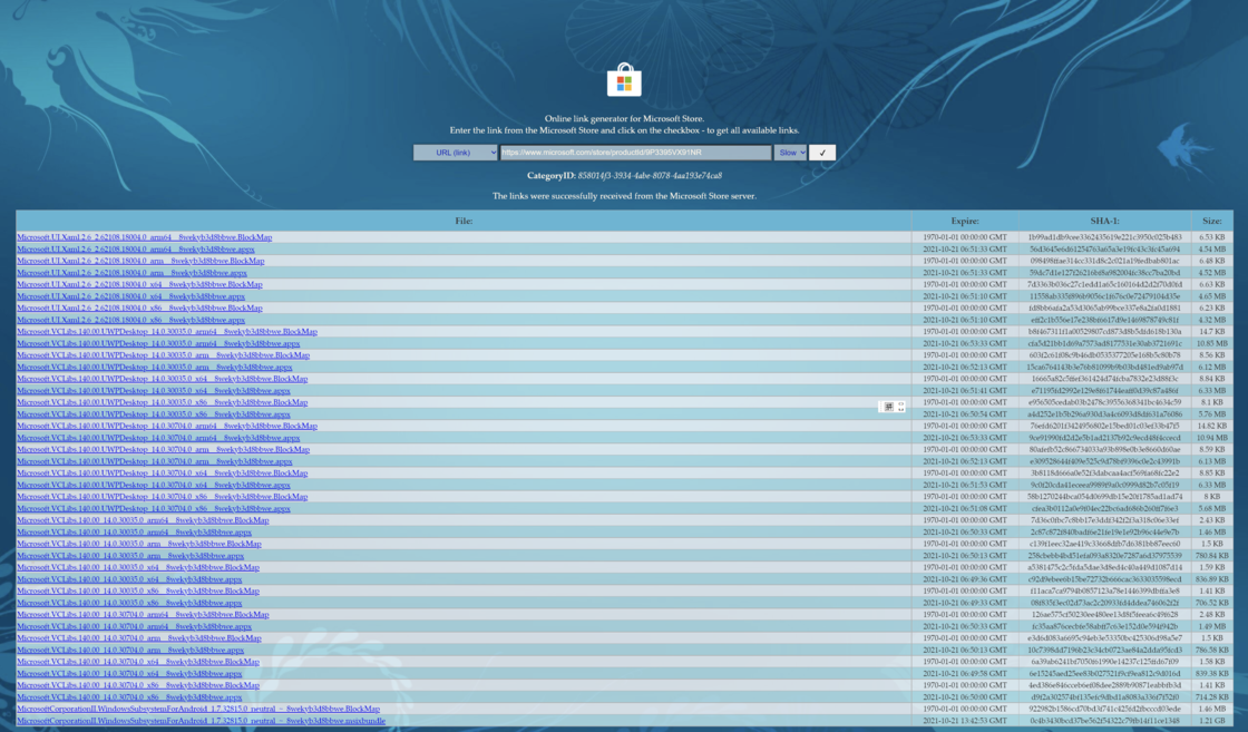 第一步,我们前往 https://store.rg-adguard.net/,在搜索框中输入 https://www.microsoft.com/store/productId/9P3395VX91NR,Channel 选择 Slow 再进行搜索。找到大小是 1.2GB 的名称类似 MicrosoftCorporationII.WindowsSubsystemForAndroid_x.x.xxxxx.x_neutral_~_8wekyb3d8bbwe.msixbundle 的文件进行下载。