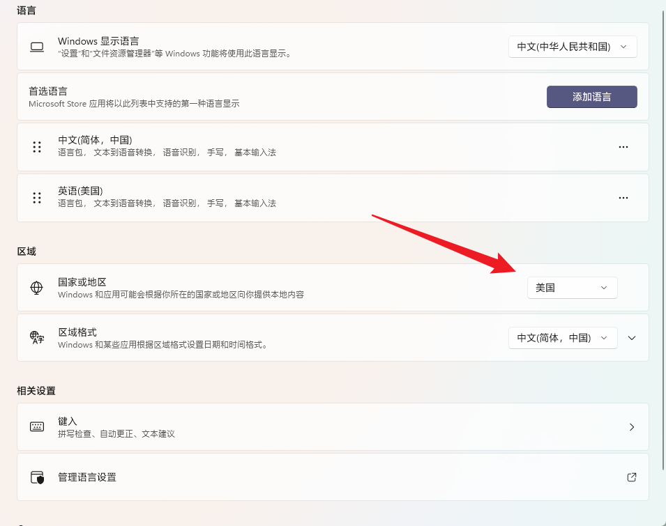 然后在 Windows 11 系统设置中将「国家或地区」更改为「美国」。