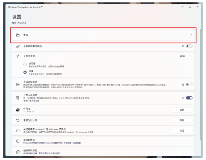 管理 Android 应用获取到的文件倒是简单一些,在 Windows Subsystem for Android 面板顶部找到「文件」并点击即可。