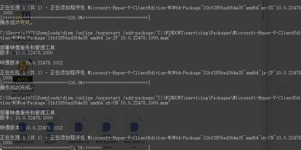 pushd "%~dp0" dir /b %SystemRoot%\servicing\Packages\*Hyper-V*.mum >hv.txt for /f %%i in ('findstr /i . hv.txt 2^>nul') do dism /online /norestart /add-package:"%SystemRoot%\servicing\Packages\%%i" del hv.txt Dism /online /enable-feature /featurename:Microsoft-Hyper-V-All /LimitAccess /ALL pause