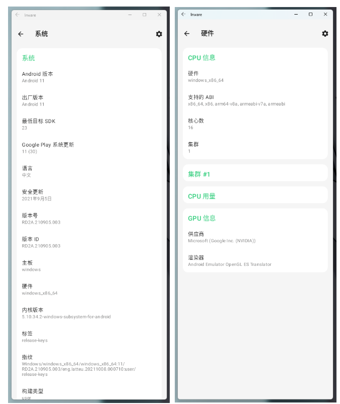 通过安装 Inware,我们也得到了关于 Android Subsystem for Windows 的更多细节,如系统版本为 Android 11、安全更新补丁级别为 9 月 5 日,内核版本则是 5.10.x。