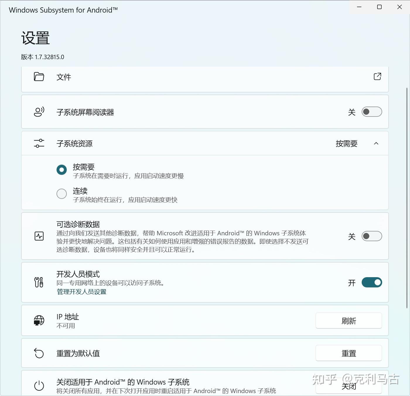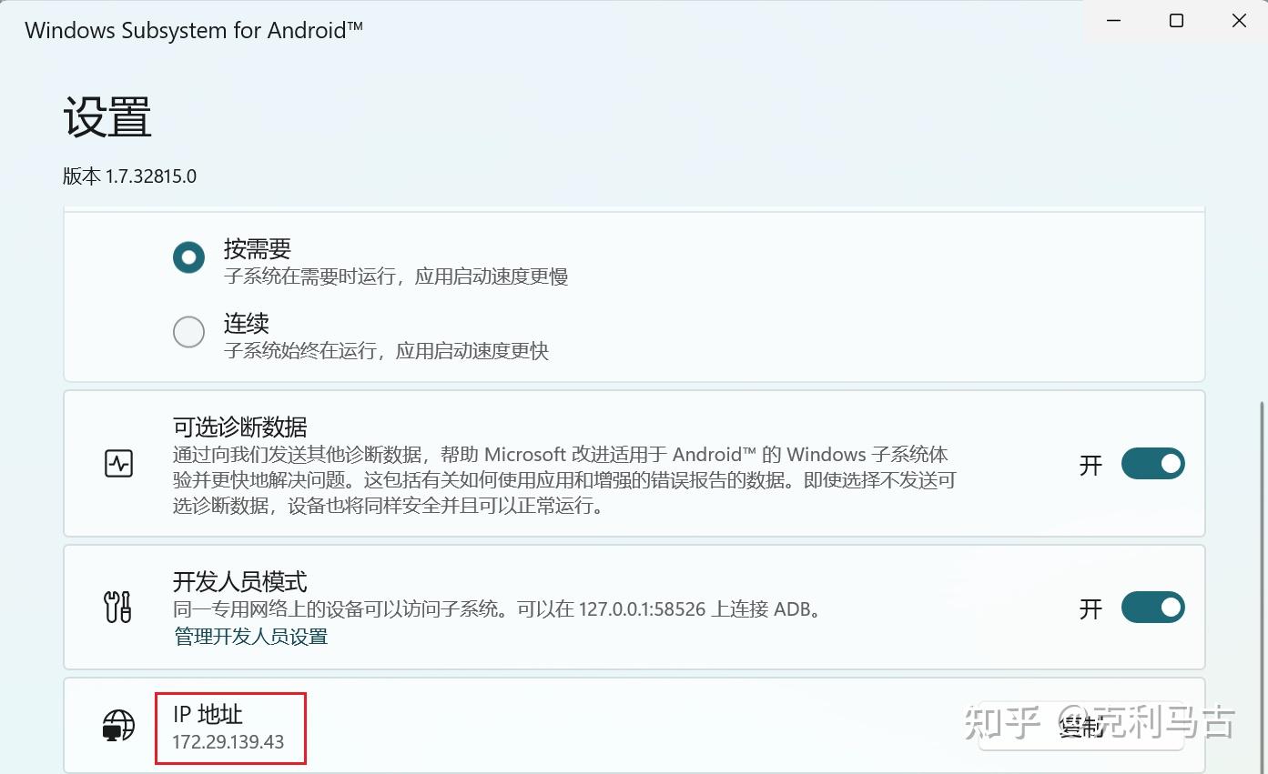 我们到子系统的设置界面看看,之前空着的 IP 地址现在有了(这个可以用来判断子系统是否在运行):