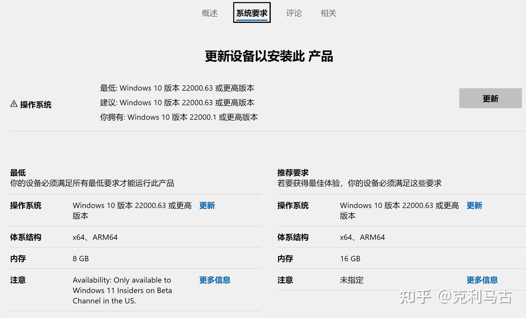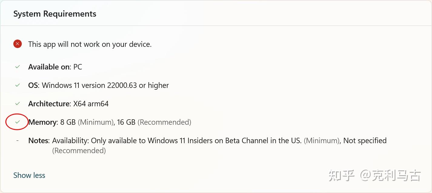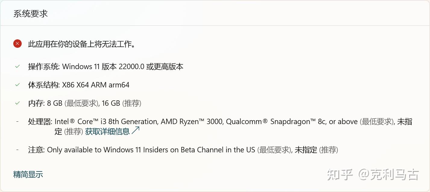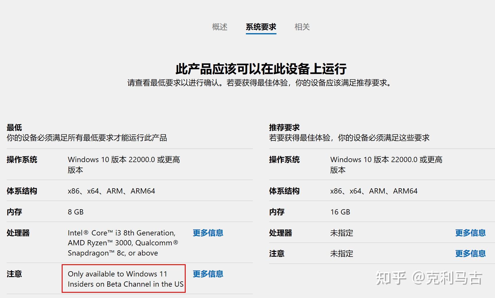 可以看到系统要求为 Win11 预览版 Beta 渠道(美国):