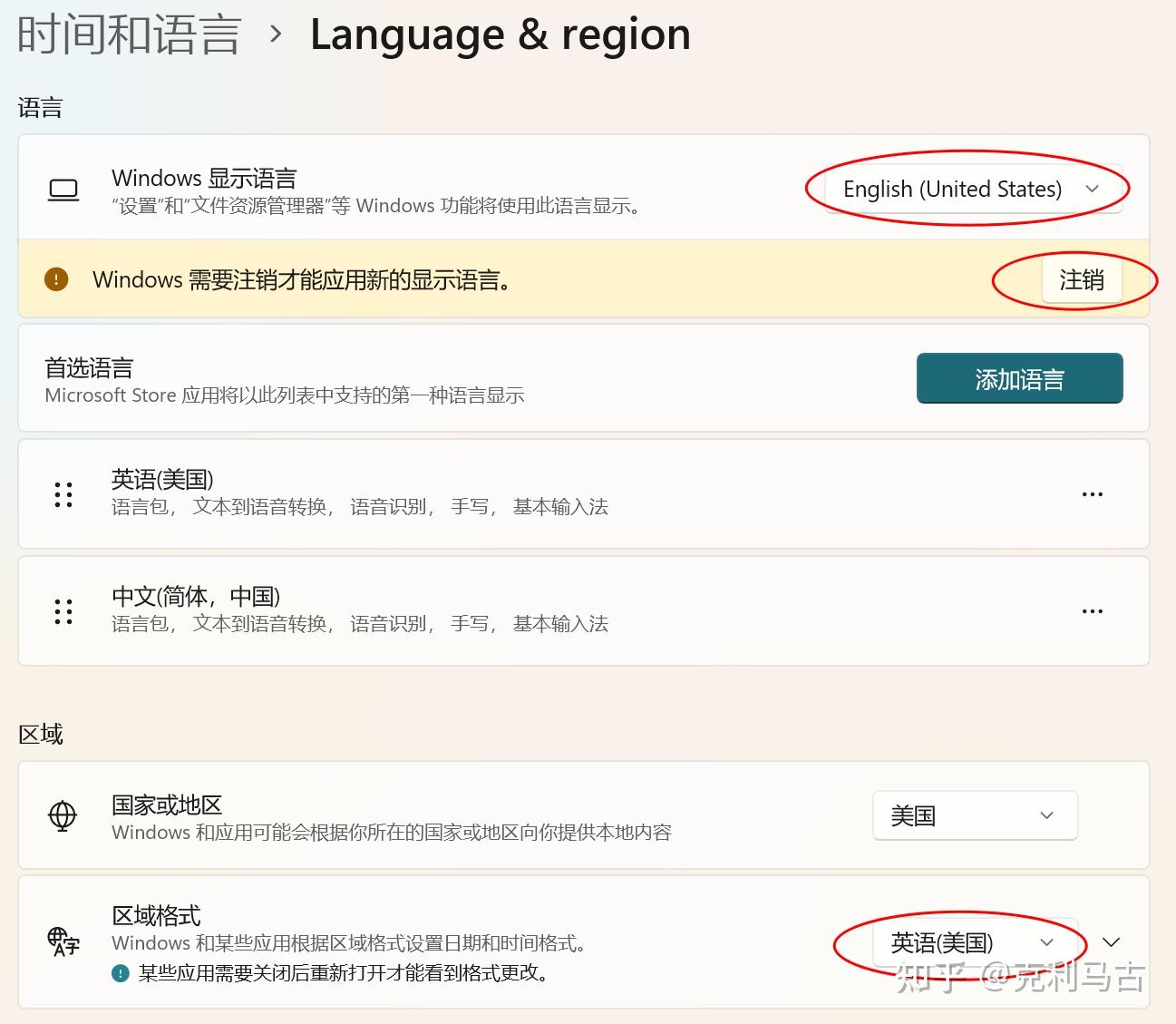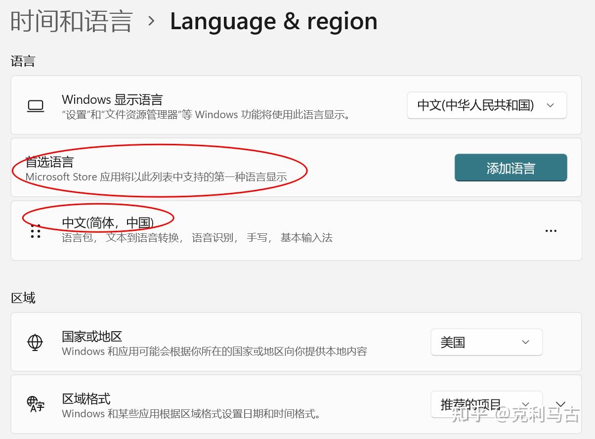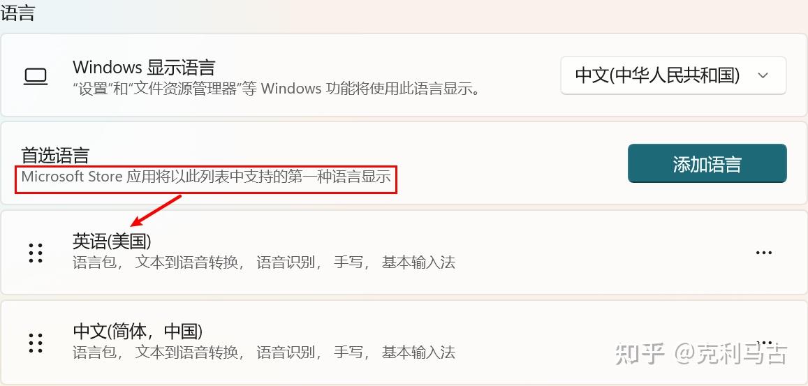 打开系统的语言设置界面,看到 “首选语言” 底下写着 “Microsoft Store 应用将以此列表中支持的第一种语言显示”,而底下只有简体中文一项,难道是这个原因?