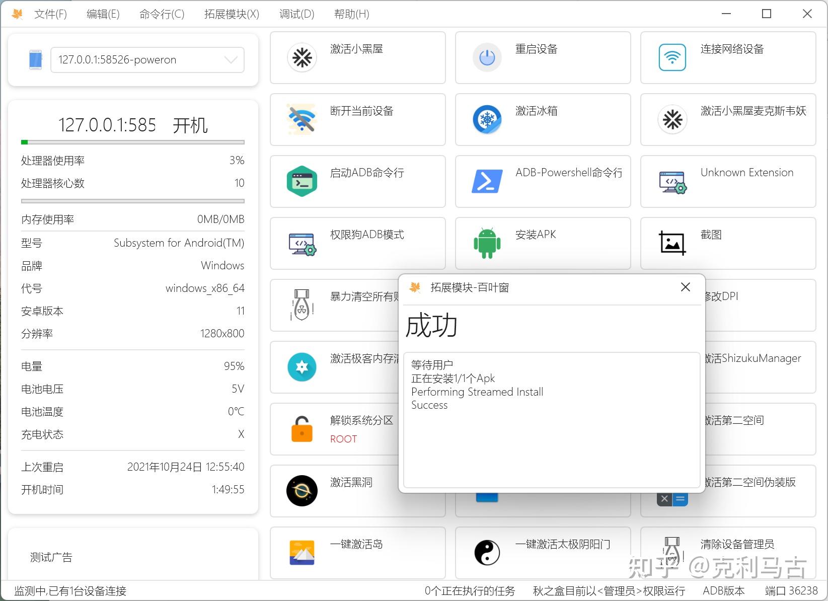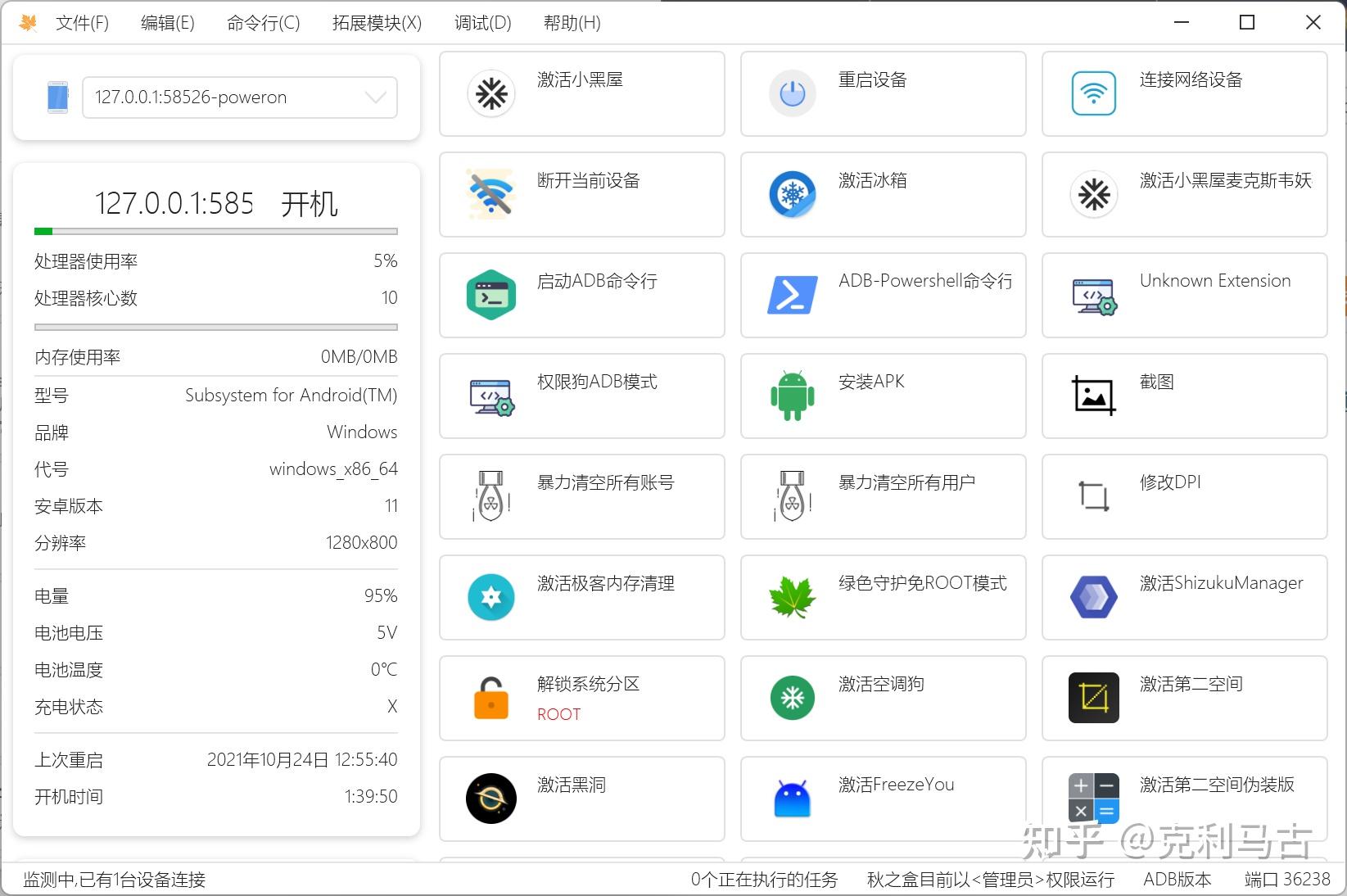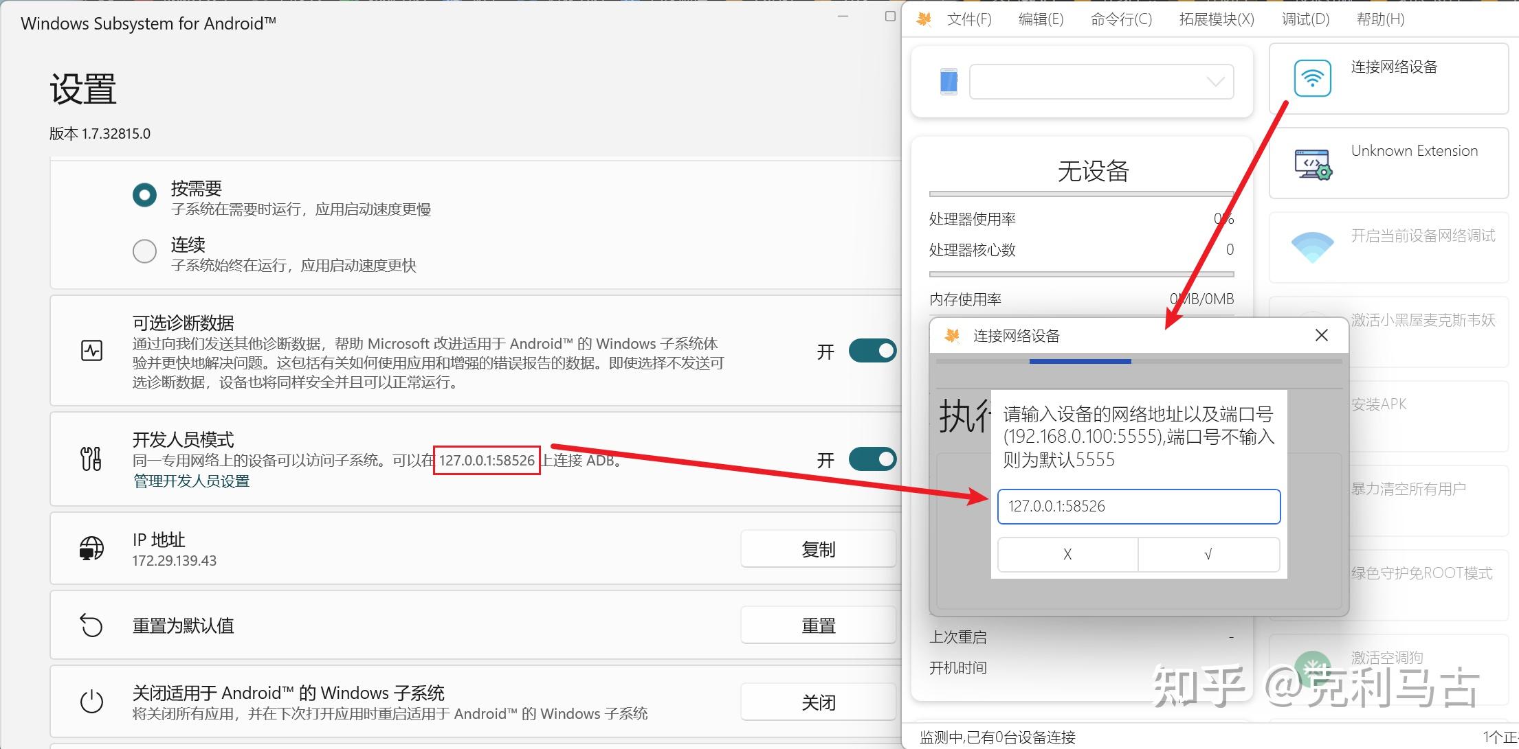 解压运行,使用 “连接网络设备” 功能进行连接(使用安卓子系统的开发人员模式的 ADB 地址):