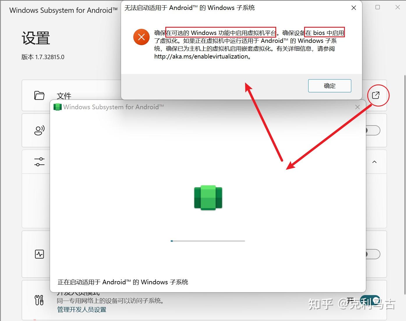 点击 “文件” 区域右上角的按钮,开始启动安卓子系统,不过弹出了错误弹窗,要求开启虚拟化(一个是启用虚拟机平台,一个是在 BIOS 中启用虚拟化):