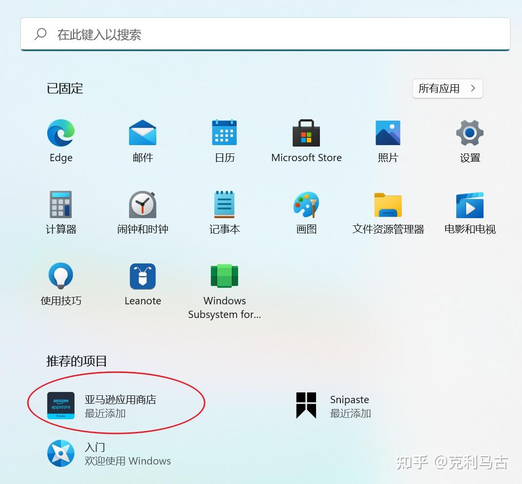 然后我们通过 “链接一” 也可以安装亚马逊商店了,安装好之后出现在了开始菜单中: