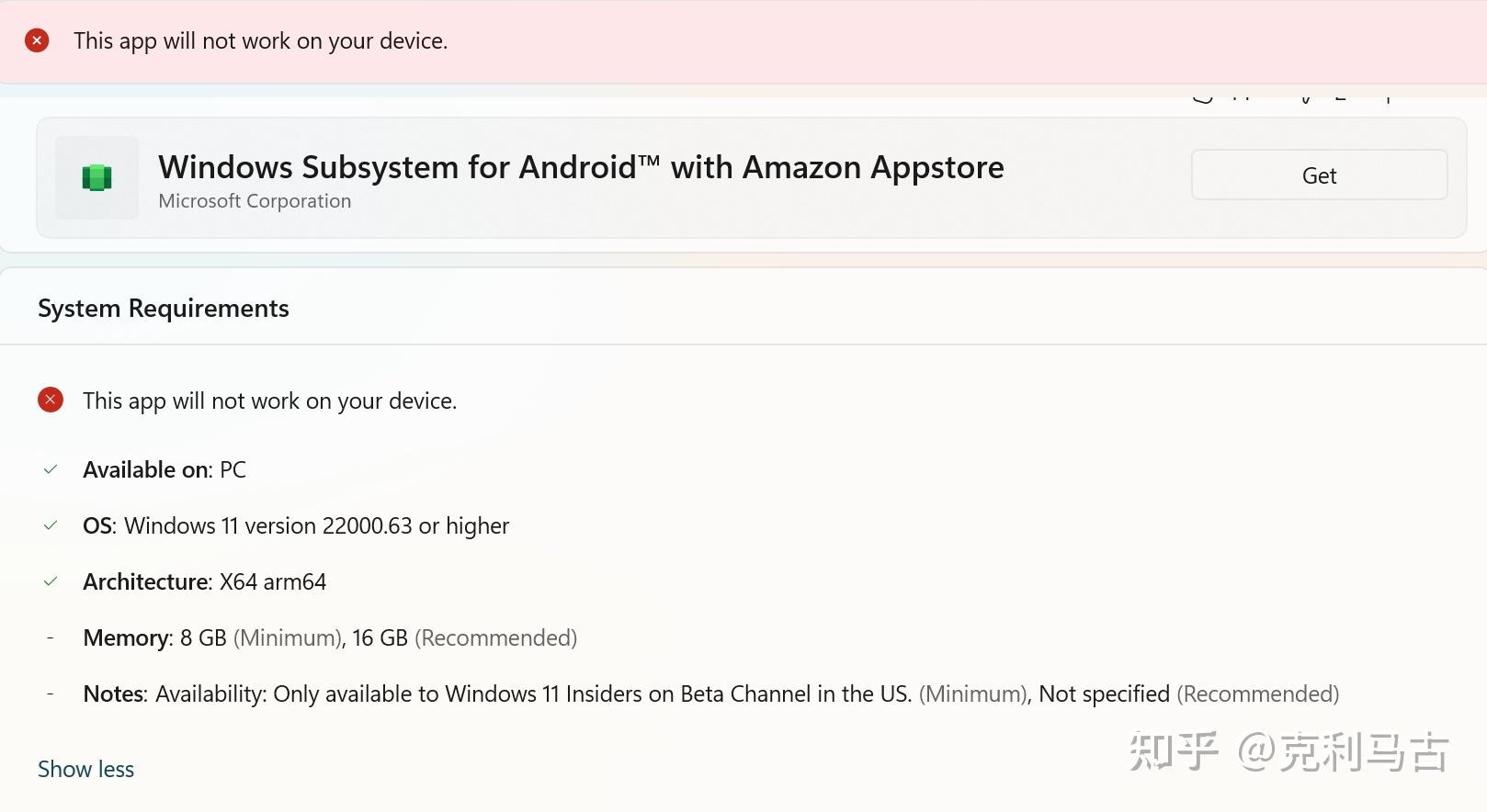 再次进入到安卓子系统(WSA)应用页面,还是不满足要求:
