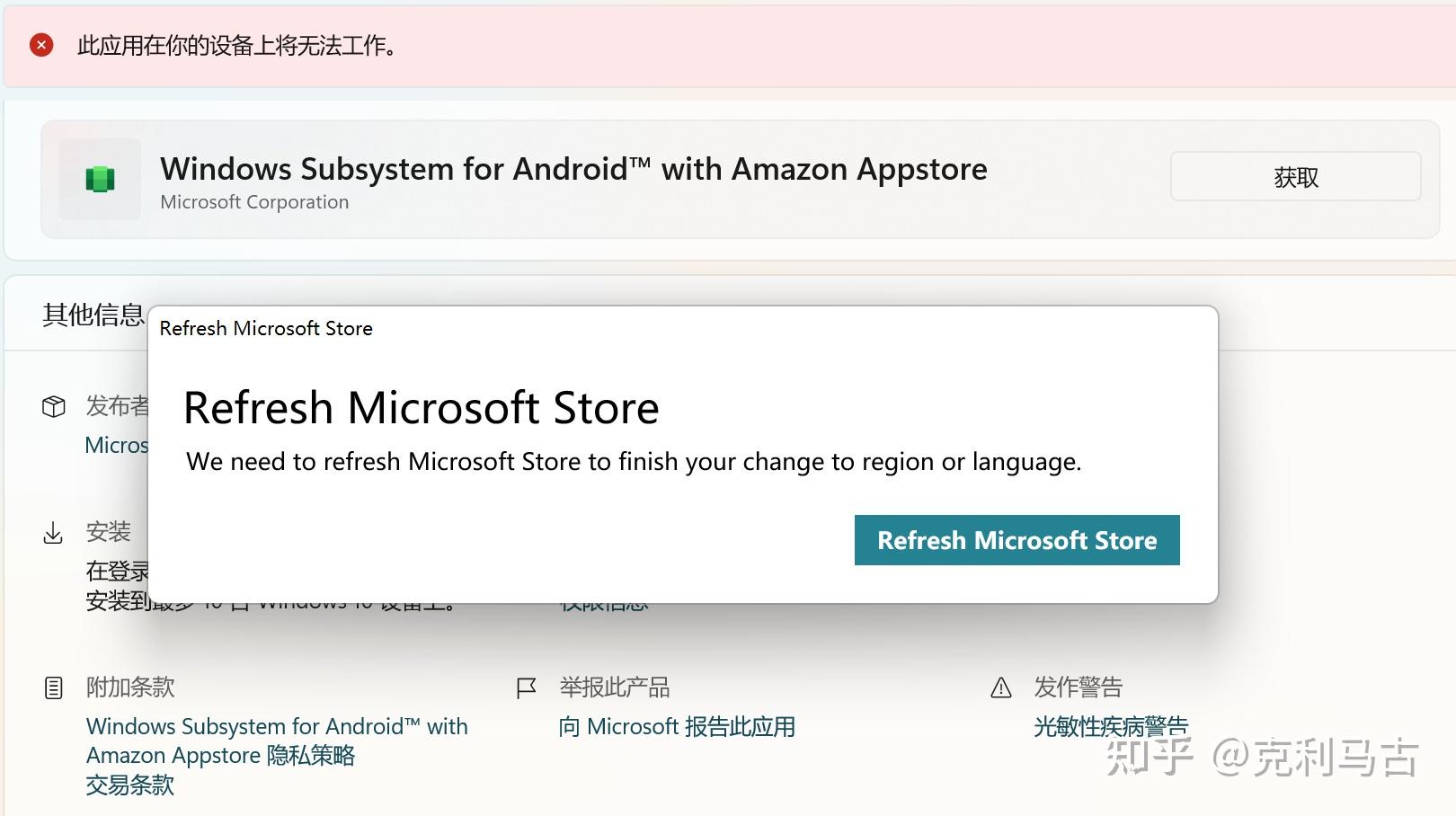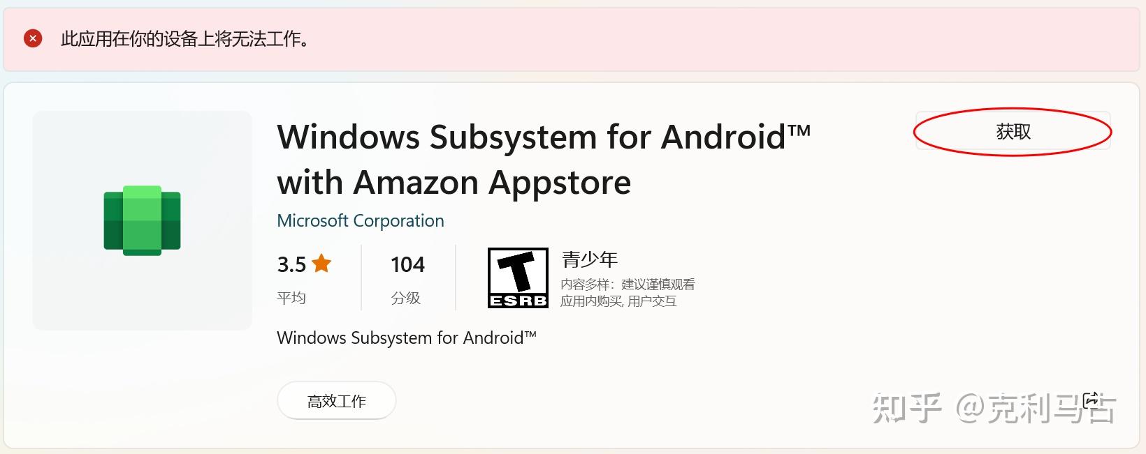 打开后,也是显示 此应用在你的设备上将无法工作,并且 “获取” 按钮是禁用的: