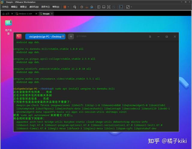 接着在输入命令:sudo apt install 安卓包名,就可以安装应用了。例如输入:sudo apt install uengine.tv.danmaku.bili 安装了 bilibili 应用。