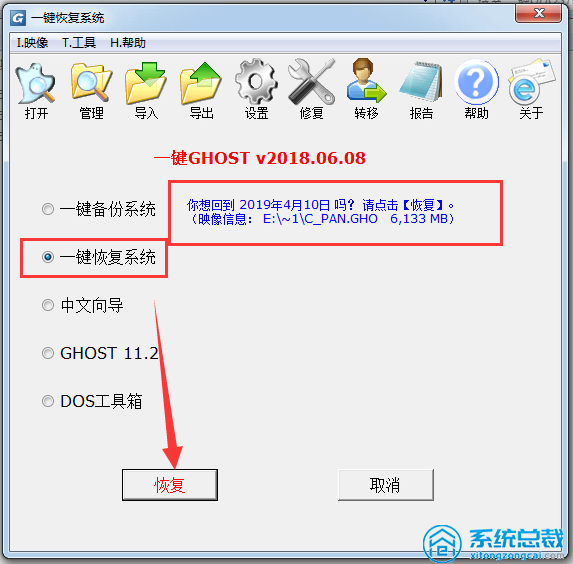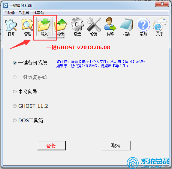 5、开启一键Ghost备份数据系统的界面,大家发觉一键恢复系统的选项是深灰色的不能启用的,此刻大家选择导进按键。