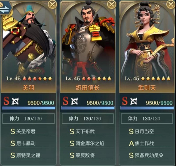 织田信长负责先手施加灼烧状态,武则天负责减伤、回复,提高队伍的续航,使队伍保持一个健康的兵力,关羽则是提供高爆发输出。