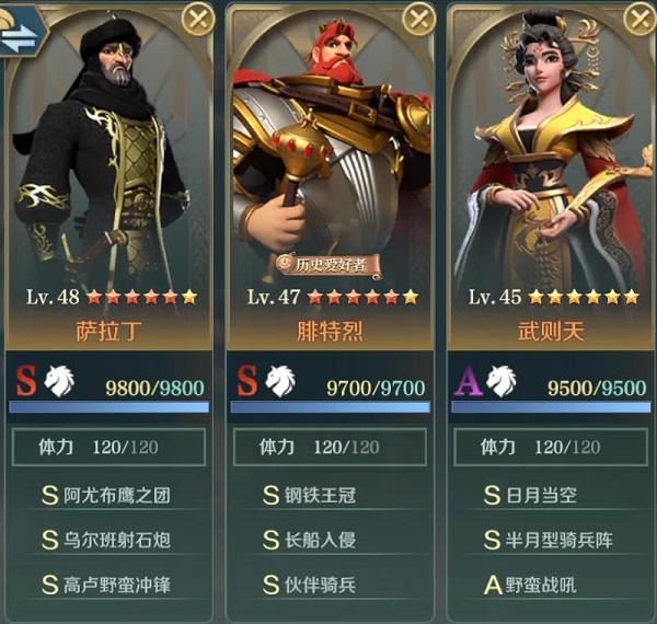 腓特烈自带技能触发概率较高,能频繁地触发伙伴骑兵的效果;再搭配上武则天削弱敌方主力输出属性的效果,可为萨拉丁提供多层连击效果加成的同时,还能为其提供良好的输出环境。