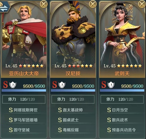 在有散兵战术的情况下,推荐用亚历山大做主将,能给汉尼拔增加伤害,以及给武则天增加回复量。依靠武则天自带技能日月当空,削弱敌军爆发,并配合预备兵动员令,达到长续航的目的,为汉尼拔提供输出空间。