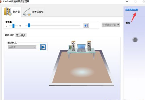 4、打开“Realtek高清晰音频管理器”后,点击右上角的“设备高级设置”。