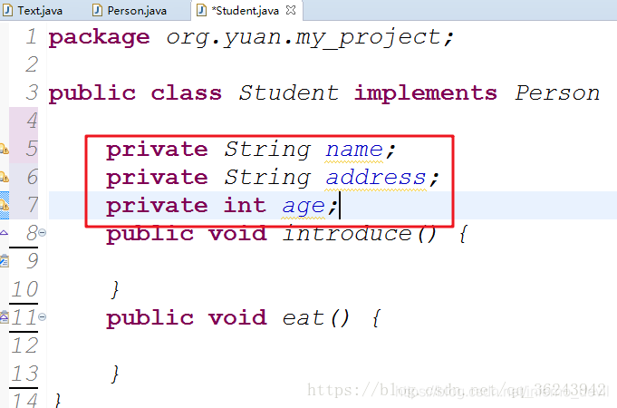 我们编辑Student.java 文件如下,我们新建了三个成员变量,现在我们想新建两个构造函数,一个是无参数构造函数,一个是带三个参数的构造函数,如何让Eclipse 自动帮我们去生成呢: