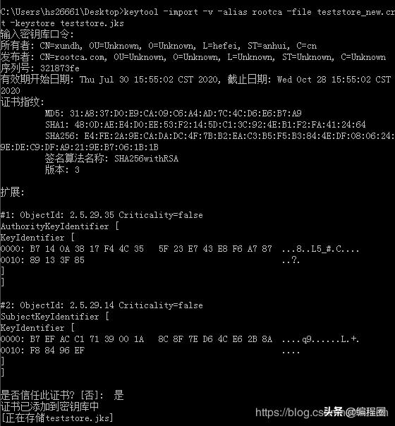 3.3 将二级证书导回teststore库中keytool -import -v -alias rootca -file teststore_new.crt -keystore teststore.jks