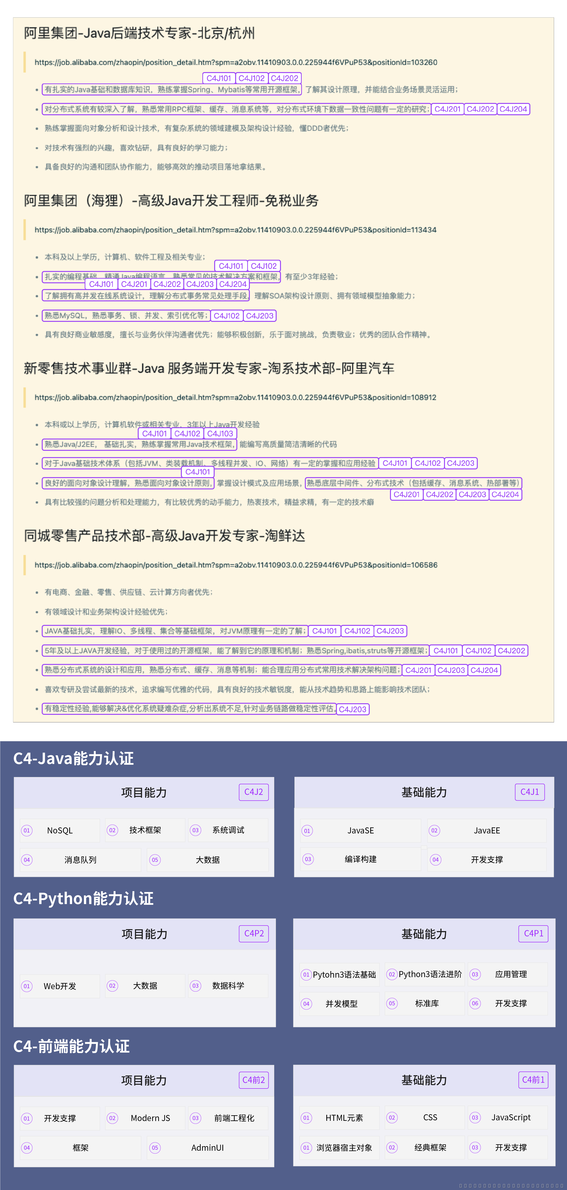 上面名企JD图标注序号对应下图C认证能力图谱中的考点内容,例如:熟悉分布式系统的设计和应用编号为C4J201,对应CSDN软件工程师能力认证中C4-Java项目能力认证中NoSQL能力。