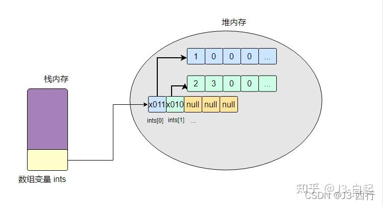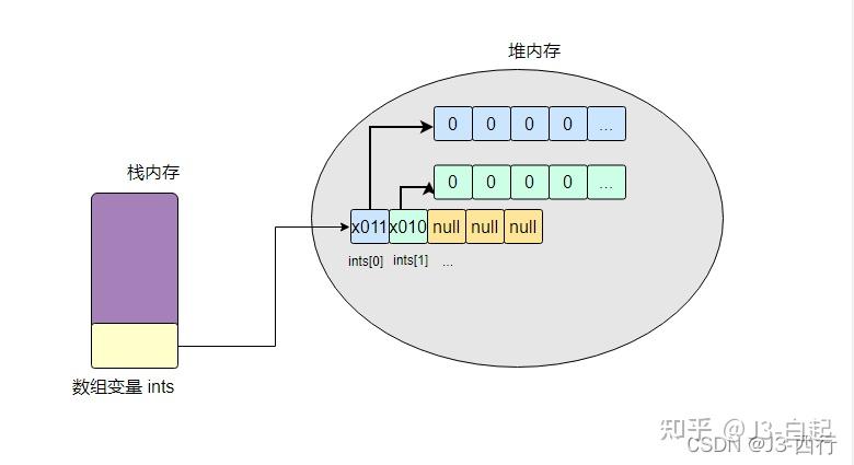 最后分别给 ints[0]、ints[1] 元素上引用类型(从程序看是一个数组)对应的位置赋值,所以最终示意图如下。