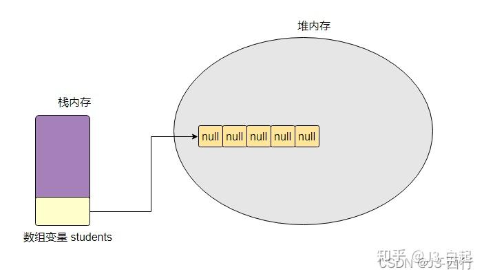 public class ArrayTest { public static void main(String[] args) { // 定义 person 类型数组,并初始化长度为 5 Person[] students = new Person[5]; // 创建 person 对象并赋值相关值 Person person1 = new Person(); person1.name = "J3"; person1.age = 18; // 调用 person 对象方法 person1.info(); // 将 person 对象赋值给数组第一个元素 students[0] = person1; students[0].info(); // 和上面雷同 Person person2 = new Person(); person2.name = "西行"; person2.age = 3256; person2.info(); students[1] = person2; students[1].info(); } }这段代码的执行过程就是经典的引用类型初始化,下面将结合示意图详细分析。