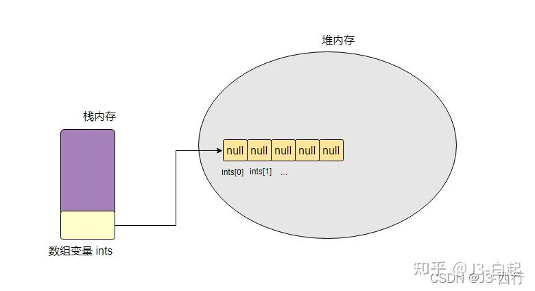 public class ArrayTest { public static void main(String[] args) { // 这是一个二维数组 int[][] ints = new int[5][]; // 给二维数组的一维数组的第一个元素初始化值,值:一个长度位 10 的数组 ints[0] = new int[10]; // 给二维数组的一维数组的第二个元素初始化值,值:一个长度位 15 的数组 ints[1] = new int[15]; // 赋值 ints[0][0] = 1; ints[1][0] = 2; ints[1][1] = 3; } }程序第一行代码 int[][] ints = new int[5][] 只是定义了一个数组(一维数组)初始值都是 null 的引用类型,示例图如下。