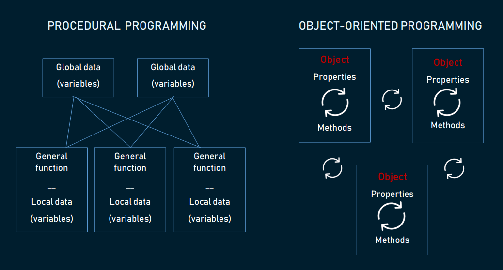 与必须使用变量和函数遵循一系列指令的另一种方法( 过程编程)相反,OOP允许您按上下文对这些变量和函数进行分组,从而对其进行标记并在每个特定对象的上下文中引用函数。