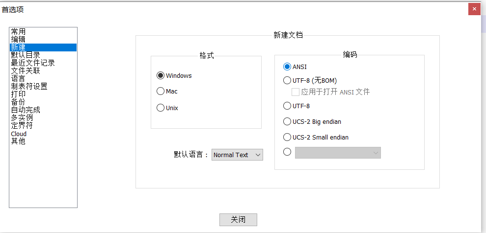 2、点击新建然后在最右边一栏选中ANSI,然后点击关闭