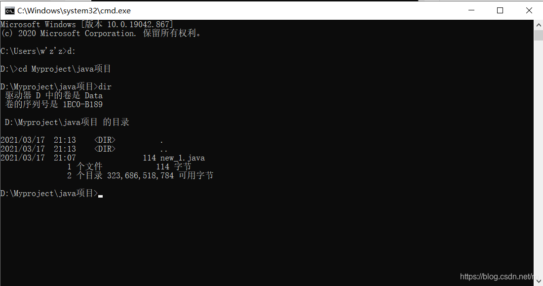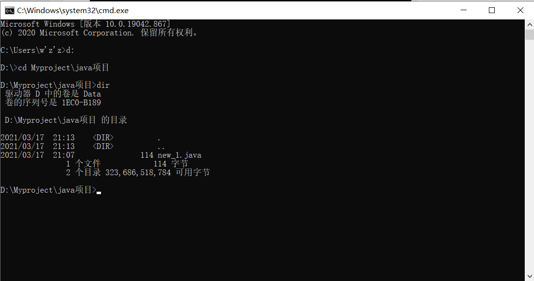 public class new_1 { public static void main(String args[]) { System.out.println("Hello java!!!"); } }2、在cmd中先输入文件所在盘+:,如我的文件在D盘,我就输入D:,回车,再输入路径,路径可在源代码所在文本的文件的上方找到,单击可复制,如图一,输入进入该文件所在的文件夹,如图二