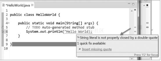 4、在输入的过程中,如果出现了漏输入或者错误的输入,将鼠标指针停留在红色处,编辑器还会做出正确的语法提示,比如说,假设我们把字符串"Hello World"少写了一个右边的双引号,则Eclipse在没有编译的情况下,就能"很贴心"地提示用户, "String literal is not properly closed by a double-quote" (字符串文字未用双引号正确地引起来) ,如下图所示。