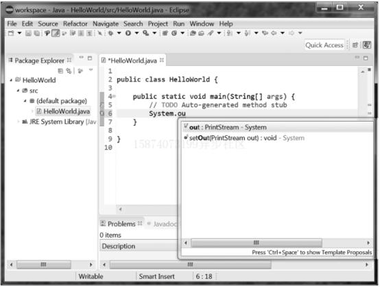 2、在第6行代码中输入System ,再输入"."后, Eclipse会智能地启动代码辅助菜单,使用上下方向键移动选中需要的项,按"Enter键确认,也可直接用鼠标在辅助菜单中双击选中System项,便可自动输入该项,如下图所示。