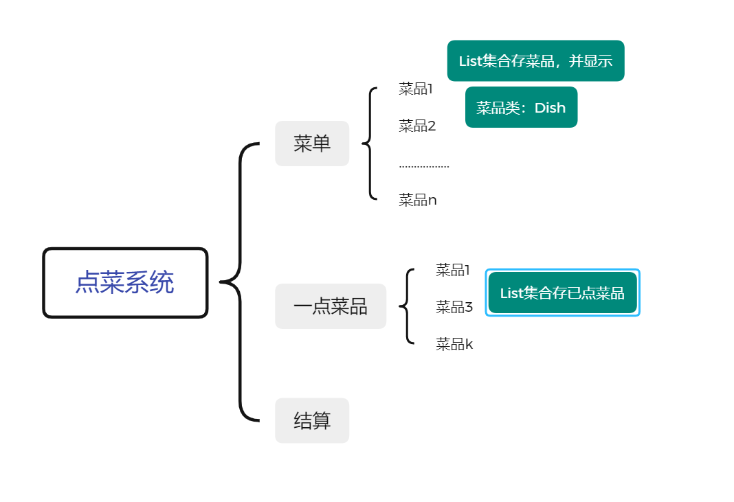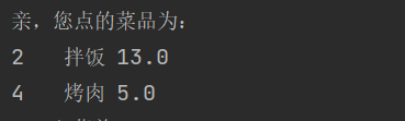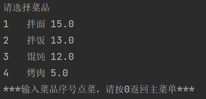 package cn.tx.demo; import java.util.ArrayList; import java.util.List; import java.util.Scanner; public class DishApp { public static void main(String[] args) { initDish(); //scanner对象 Scanner s = new Scanner(System.in); while (true) { showManue(); //获取内容 阻塞状态 int num = s.nextInt(); //判断操作 switch (num) { case 1: while(true) { showDishManue(); int id = s.nextInt(); // System.out.println("您所输入的序号为"+id); if (id == 0) break; Dish dish = nihilist.get(id - 1); System.out.println("亲,您点了" + dish.name); PersonDish.add(dish); } case 2: showPersonDish(); break; case 3: buy(); //System.out.println("14块"); return; } } } //集合,存菜品 static List nihilist = new ArrayList();//菜单集合 static List PersonDish= new ArrayList();//用户菜单 //展示主菜单 public static void showManue() { System.out.println("***主菜单***"); System.out.println("1\t\t\t菜单"); System.out.println("2\t\t\t已选菜品"); System.out.println("3\t\t\t买单"); System.out.println("请选择操作:"); } //初始化菜品 public static void initDish() { //Dish dish = new Dish(1, "拌面", 15.0); nihilist.add(new Dish(1, "拌面", 15)); // nihilist.add(dish); nihilist.add(new Dish(2, "拌饭", 13)); //Dish dish2 = new Dish(2, "拌饭", 13.0); // nihilist.add(dish2); nihilist.add(new Dish(3, "馄饨", 12)); //Dish dish3 = new Dish(3, "馄饨", 12.0); //nihilist.add(dish3); nihilist.add(new Dish(4, "烤肉", 5)); } //展示菜单 public static void showDishManue() { System.out.println("请选择菜品"); //遍历集合 for (int i = 0; i < nihilist.size(); i++) { //使用i下标获取菜品 Dish dish=nihilist.get(i); System.out.println(dish.id+"\t"+dish.name+"\t"+dish.price); } System.out.println("***输入菜品序号点菜,请按0返回主菜单***"); } //展示已选 public static void showPersonDish(){ System.out.println("亲,您点的菜品为:"); for (int i = 0; i < PersonDish.size(); i++) { //使用i下标获取菜品 Dish dish1=PersonDish.get(i); System.out.println(dish1.id+"\t"+dish1.name+"\t"+dish1.price); } } //买单走人 public static void buy(){ System.out.println("***正在结算***"); double sum=0; for(Dish dish1:PersonDish){ sum+= dish1.price; } System.out.println("亲,本次共消费了"+sum); } }系统很简单,也没有复杂的函数,需要注意的是在switch语句中break语句的使用和集合的遍历