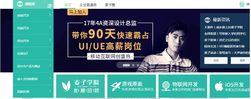 生活在这个充满竞争,血腥味十足分分钟钟就会别人取代的大数据移动互联时代,大家一有点时间就会拼命地给自己打鸡血充电学习,让自己可以拥有一专多能无缺陷的斜杠青年!其实,更多人害怕的是自己在某个时候落后于别人,被后来者取代。所以自学技能成为当下很流行的一个充电方式,一来可以不用花一大堆钱报很多培训班就可以自学多种技能,而来还可以省下很多时间,真是一举两得的事情,但是大家可能在网络学习一般没有针对性,一去就是百度,找不到自己喜欢的自学网站,所以,今天艺林小宇就给大家推荐几个值得大家去自学的网站。一来可以省下大家较多的时间去寻找这些自学网站,二来还可以这些网站中找到适合自己的自学网站。1、麦子学院