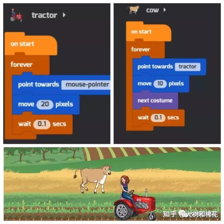 《揭秘农场》中有个小故事,天亮了,农场主开着拖拉机带领奶牛要去牛棚挤奶,怎么走呢?孩子移动鼠标,拖拉机跟着鼠标走,奶牛跟着拖拉机.....通过十几块的积木块编程,孩子自己就能创作一个农场奶牛挤奶的路线小故事,一会儿看到拖拉机移除屏幕外,一会儿说奶牛转晕了,自己咯咯咯的傻笑。