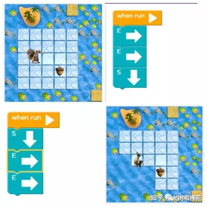 看,第一张地图中,只需要拖动3个箭头积木块就帮助松鼠顺利找到榛子;第二张地图中,我们选择了先下后右,结果落水啦。