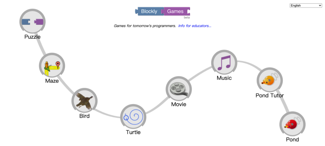 Blockly也是一个内容布局非常“一目了然”的网站,它由一系列编程教学游戏组成。主要是为没有编程经验的孩子们设计的。