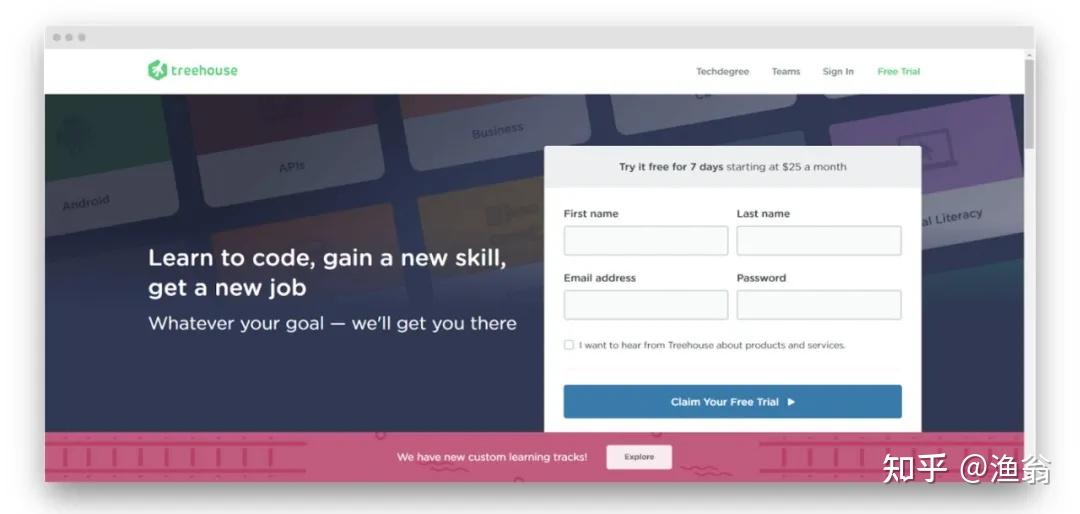 Treehouse是另一个将编程知识简单化讲解的平台,它会教你处理特定项目所需的技能,比如创建一个APP,创建一个WordPress博客等。Treehouse支持所有流行的编程语言——Java、Python、c++、Ruby和其他语言,具有以下好处: