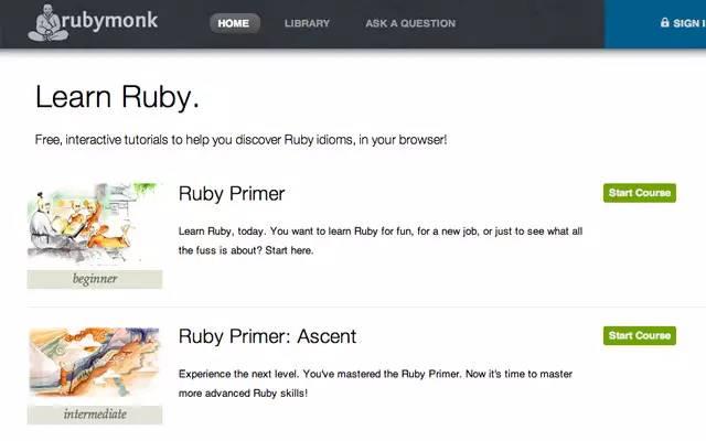 RubyMonk是一个互动的Ruby学习平台。你可以通过课程、问题解决或者相关文章来学习Ruby。RubyMonk有一个初学者课程选项,两个中级选项以及一个高级选项。