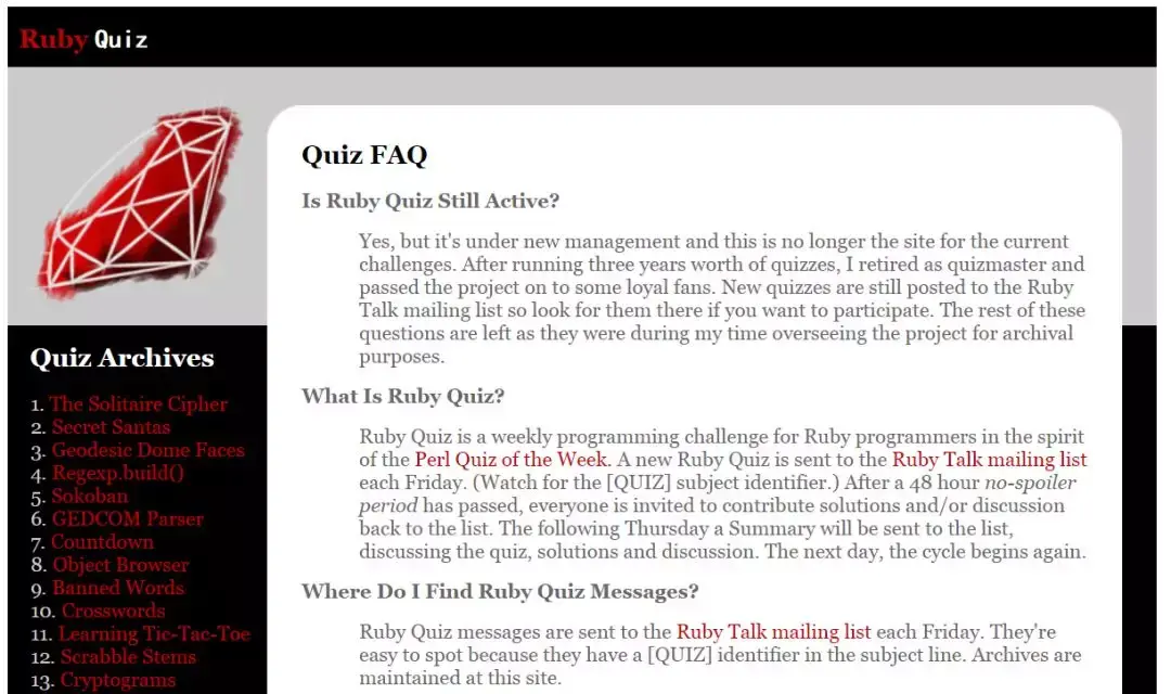 Ruby Quiz 是一个面向 Ruby 程序员的每周编程挑战项目,目前有 156 个测验项目。