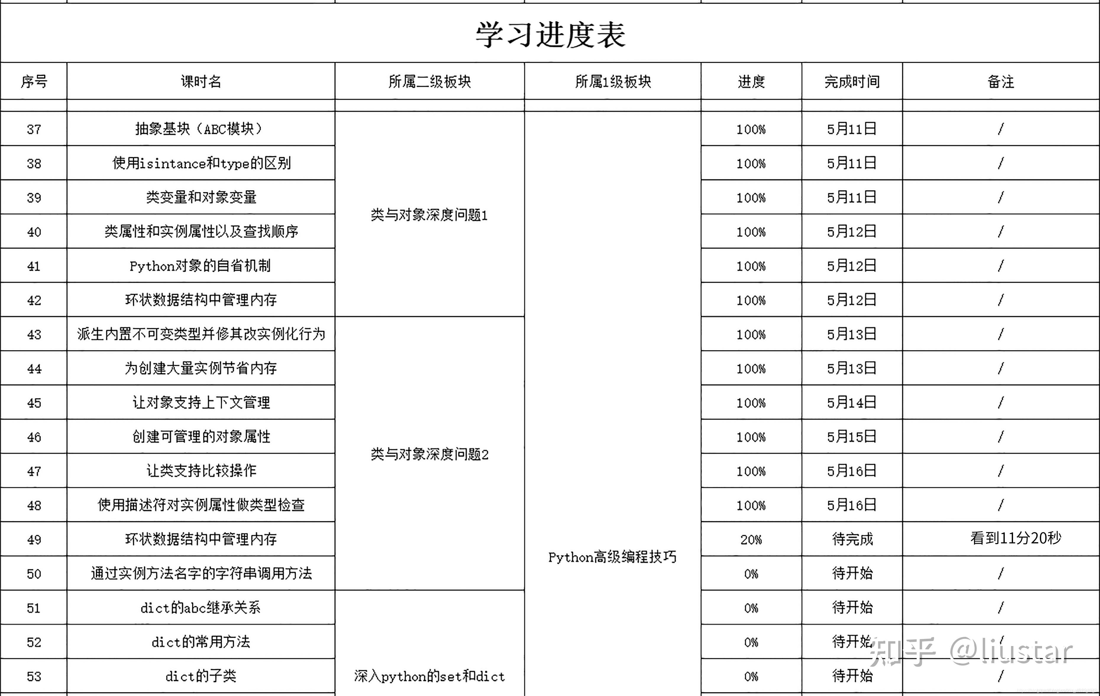 学习进度表大概是这个样子的,自己去做1个,上面具体到每一节课、进度、完成时间和备注,好处就是: