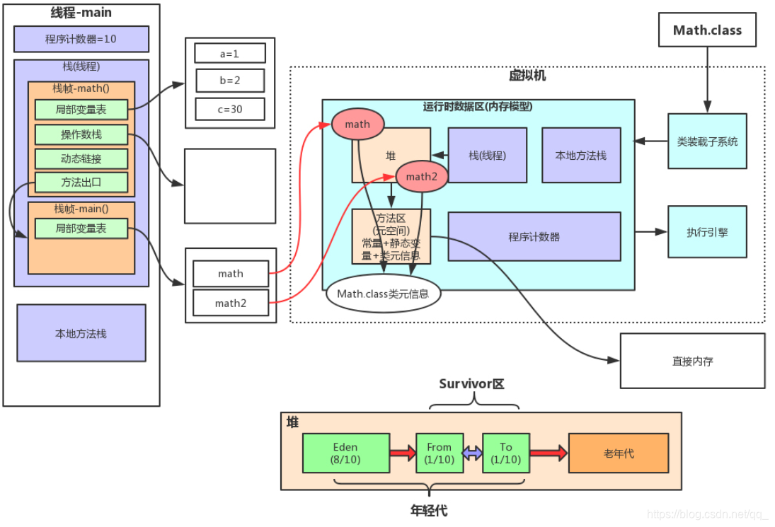 到这里,我们就可以通过字节码在jvm底层结构理解整个Java代码的执行过程。