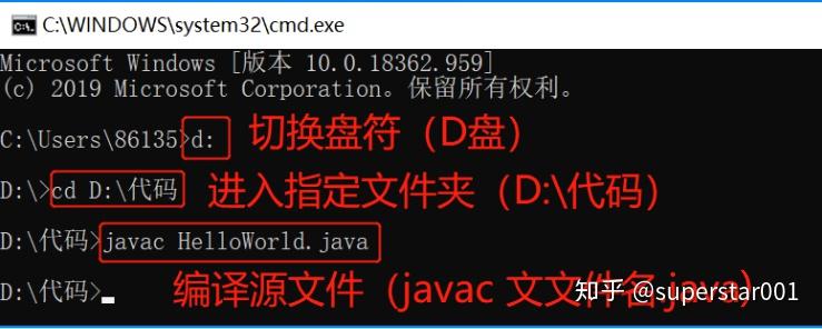 在 CMD 窗口进入源文件所在目录,使用 javac 命令编译源文件:
