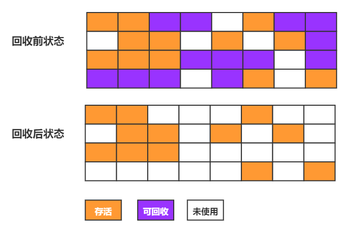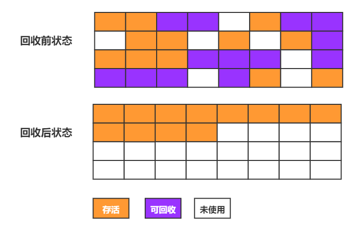 标记整理算法与标记清除算法一致,但后续步骤不是直接对可回收对象进行清理,而是让所有存货的对象都向内存空间一端移动,然后直接清理掉边界以外的内存